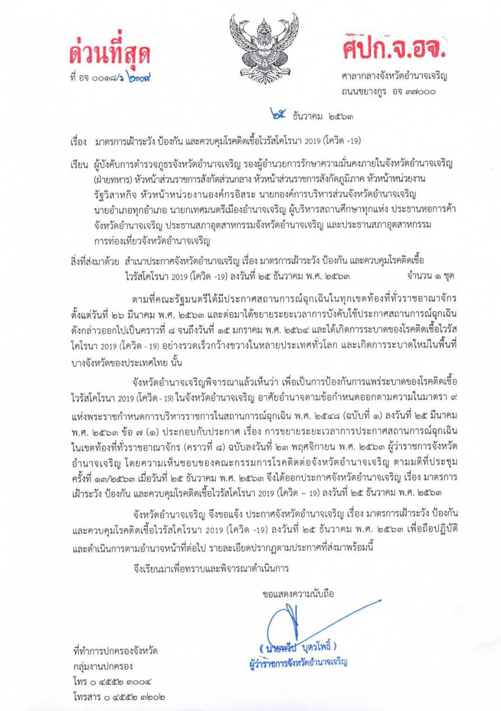 ชื่อเรื่อง : ประกาศ จังหวัดอำนาจเจริญ มาตรการเฝ้าระวัง ป้องกัน และควบคุมโรคติดเชื้อไวรัสโคโรนา 2019 (โควิด 19)