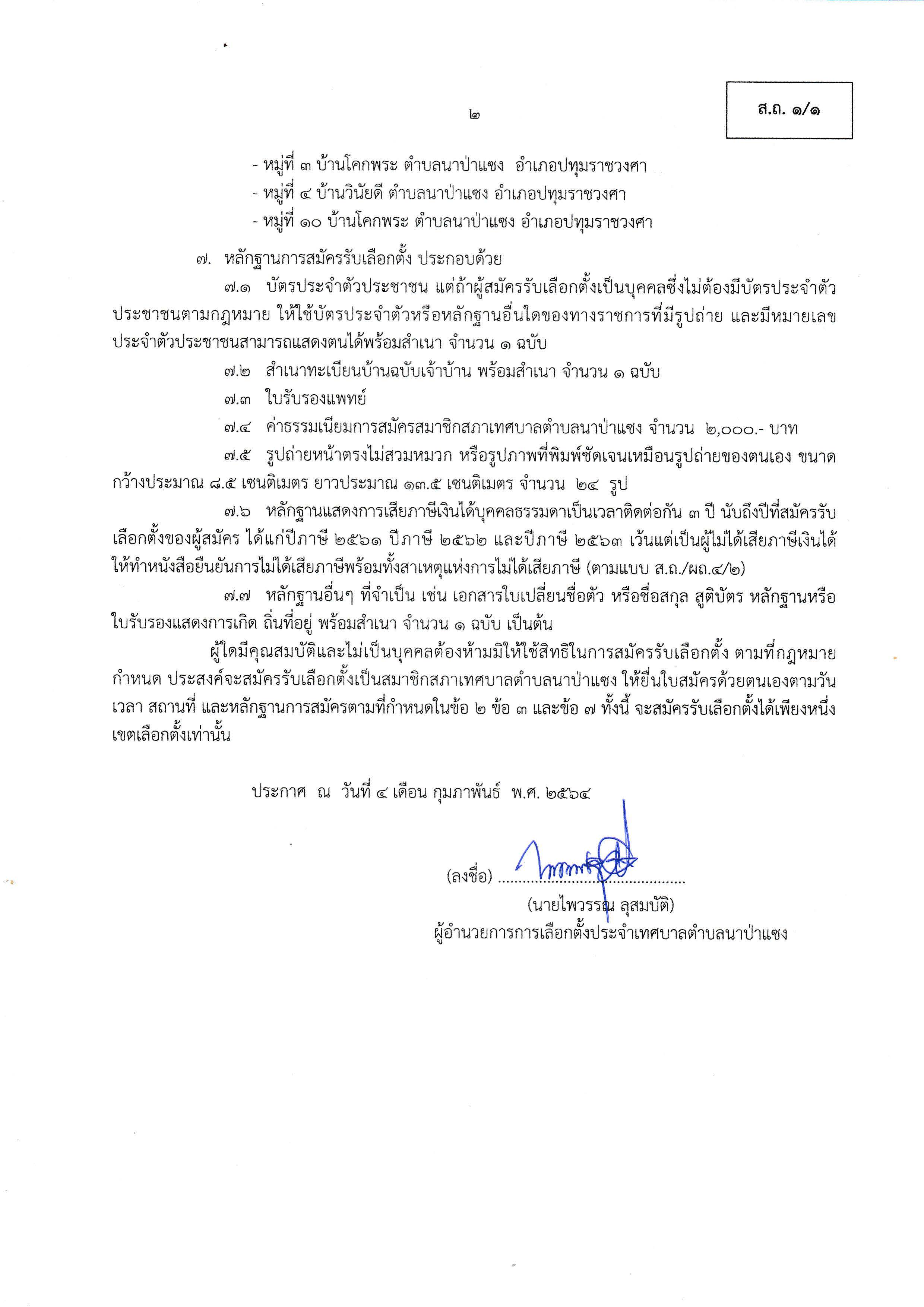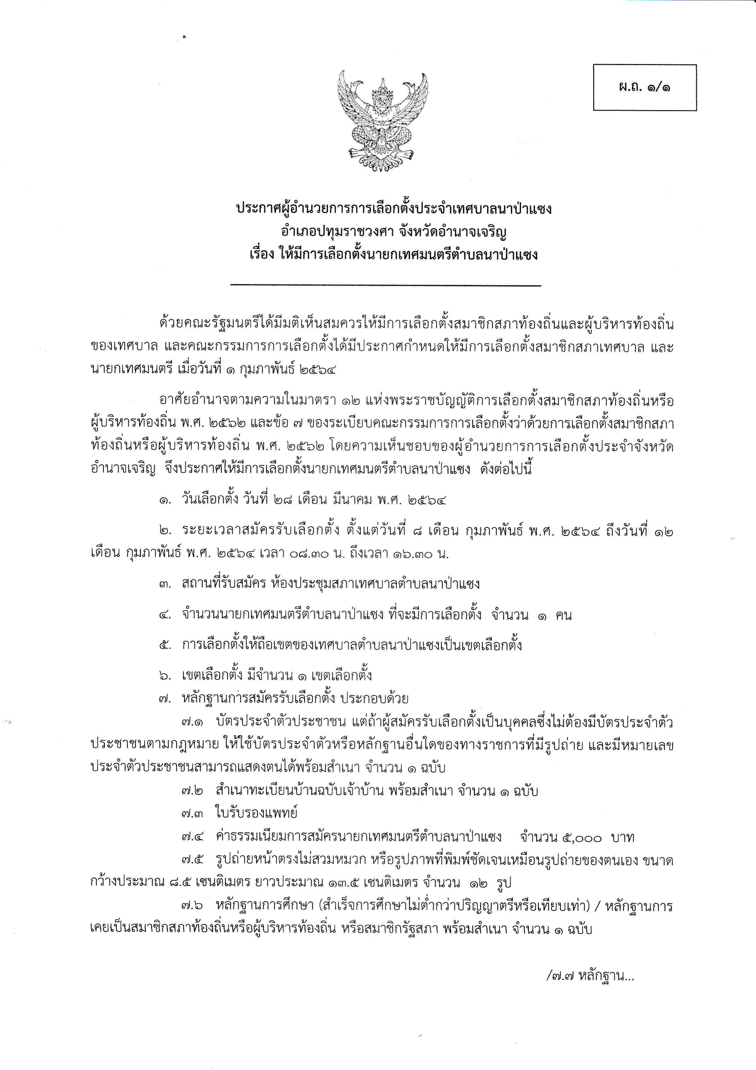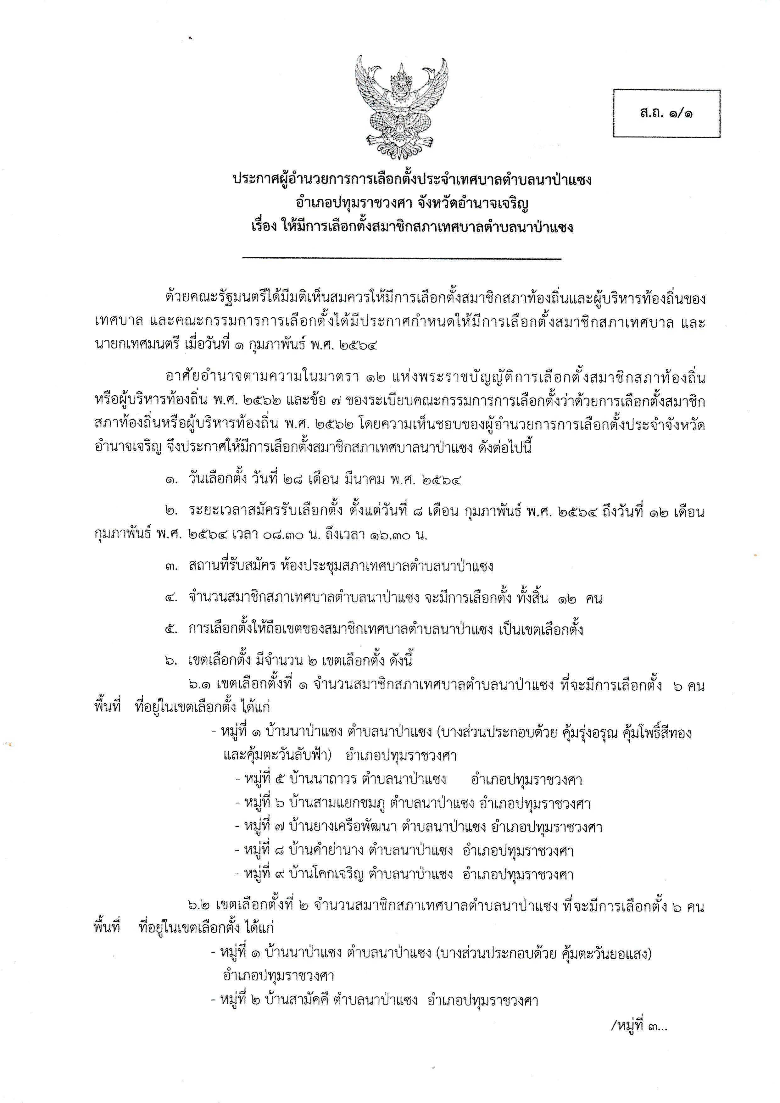 ชื่อเรื่อง : ประกาศให้มีการเลือกตั้งสมาขิกสภาเทศบาลตำบลนาป่าแซง (ส.ถ.๑/๑) และนายกเทศมนตรีตำบลนาป่าแซง (ผ.ถ.๑/๑)