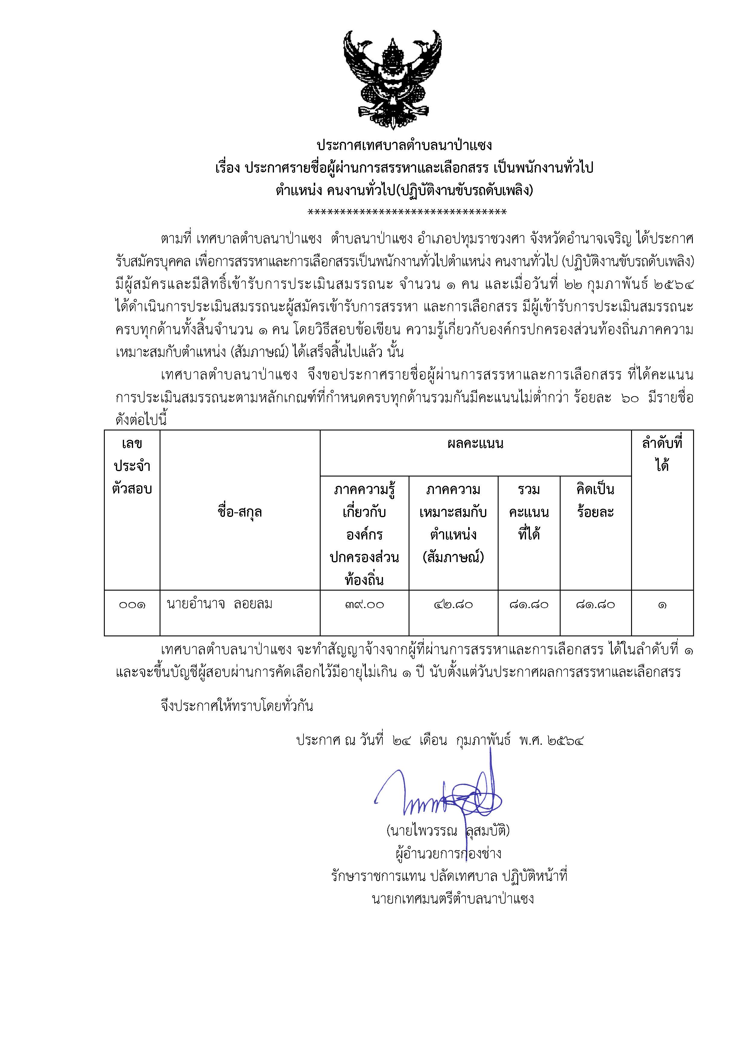 ชื่อเรื่อง : ประกาศเทศบาลตำบลนาป่าแซง เรื่อง ประกาศรายชื่อผู้ผ่านการสรรหาและเลือกสรร เป็นพนักงานทั่วไป