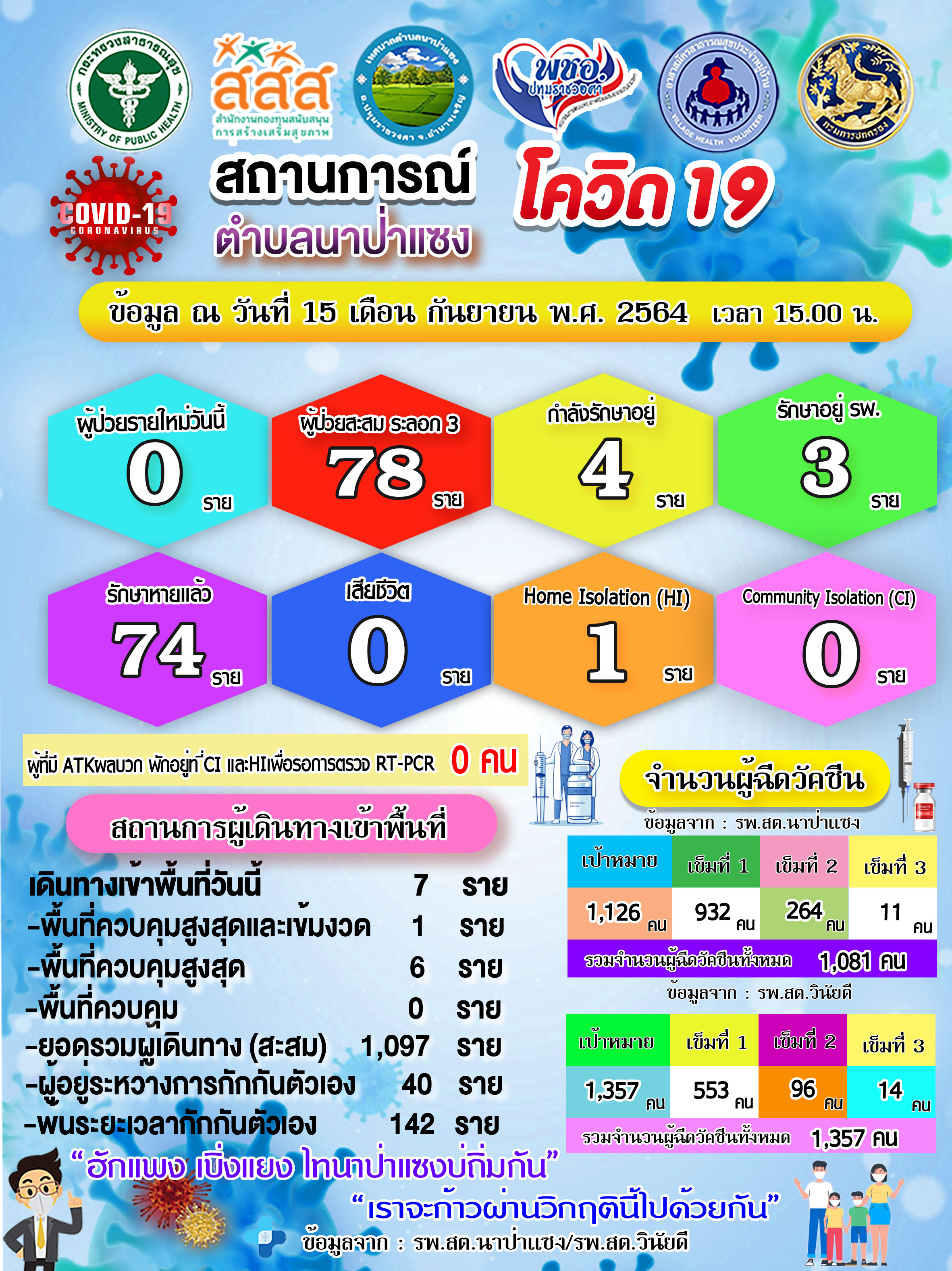 ชื่อเรื่อง : รายงานสถานการณ์การเฝ้าระวังการป้องกันควบคุมโรค covid-19 ตำบลนาป่าแซง ประจำวันที่ 15 เดือน กันยายน พ.ศ. 2564 (สรุปเวลา 15.00 น.)