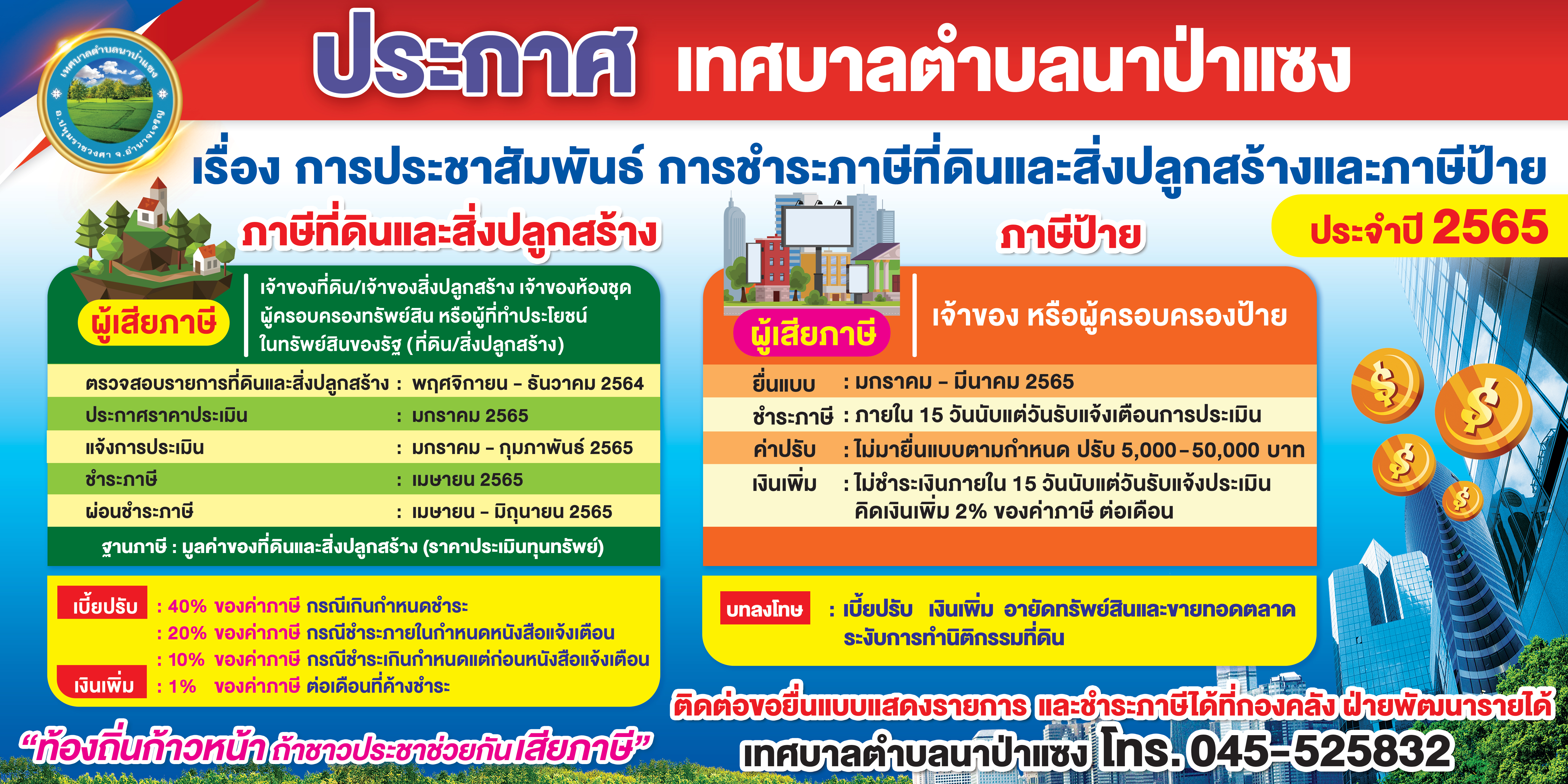 ประชาสัมพันธ์การจัดเก็บภาษีที่ดินและสิ่งปลูกสร้าง ประจำปี พ.ศ. 2565 เทศบาลตำบลนาป่าแซง