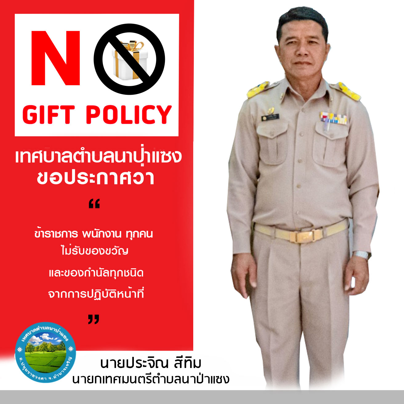 ประกาศเทศบาลตำบลนาป่าแซง เรื่อง นโยบายไม่รับของขวัญ (No Gift Policy)