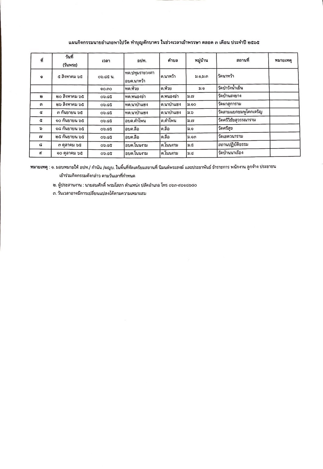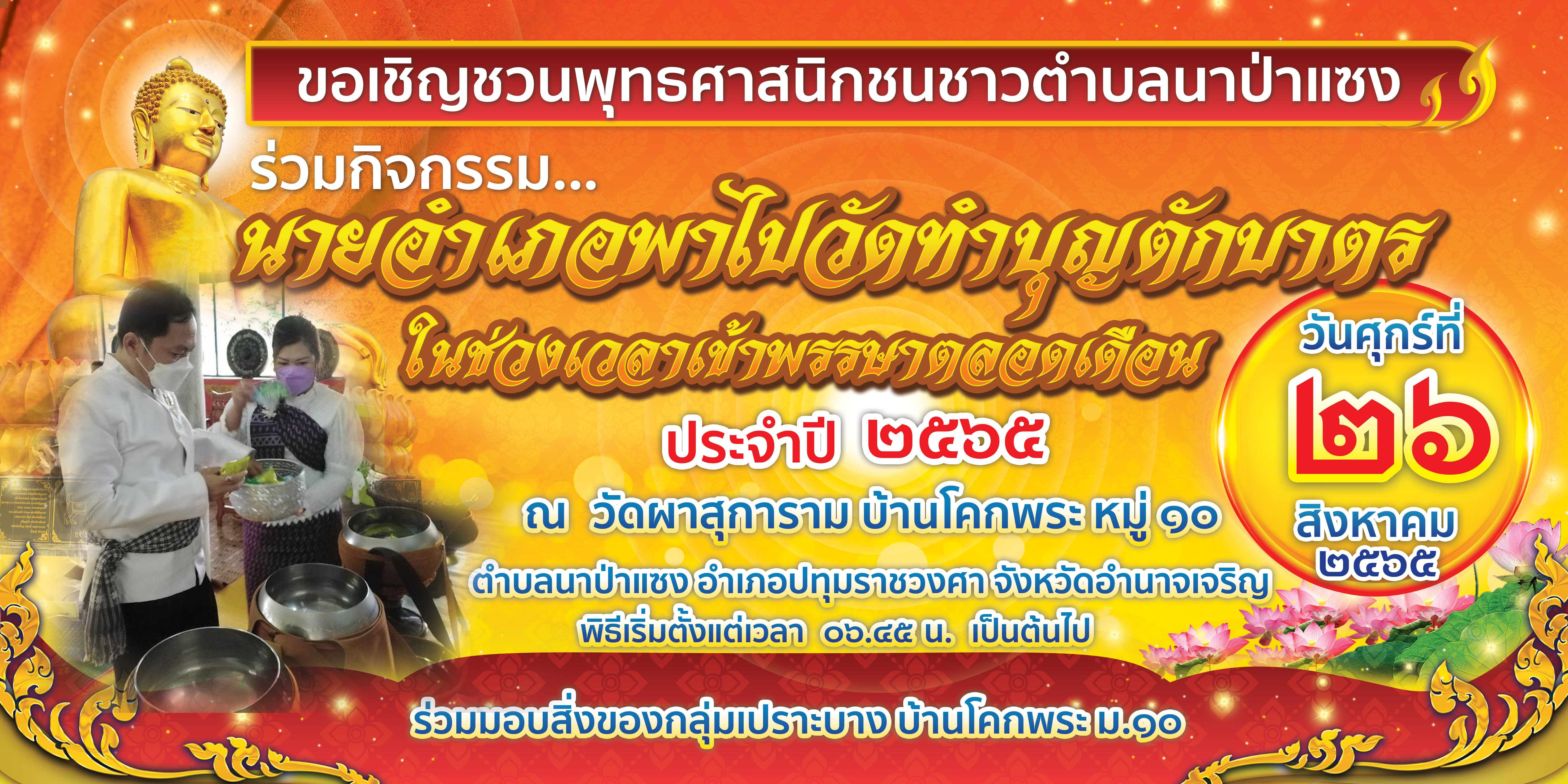 ชื่อเรื่อง : ขอเชิญพุทธศาสนิกชน พี่น้องชาวตำบลนาป่าแซง ร่วมกิจกรรมนายอำเภอพาไปวัด ทำบุญตักบาตร ในช่วงเวลาเข้าพรรษา ตลอด 3 เดือน ประจำปี 2565