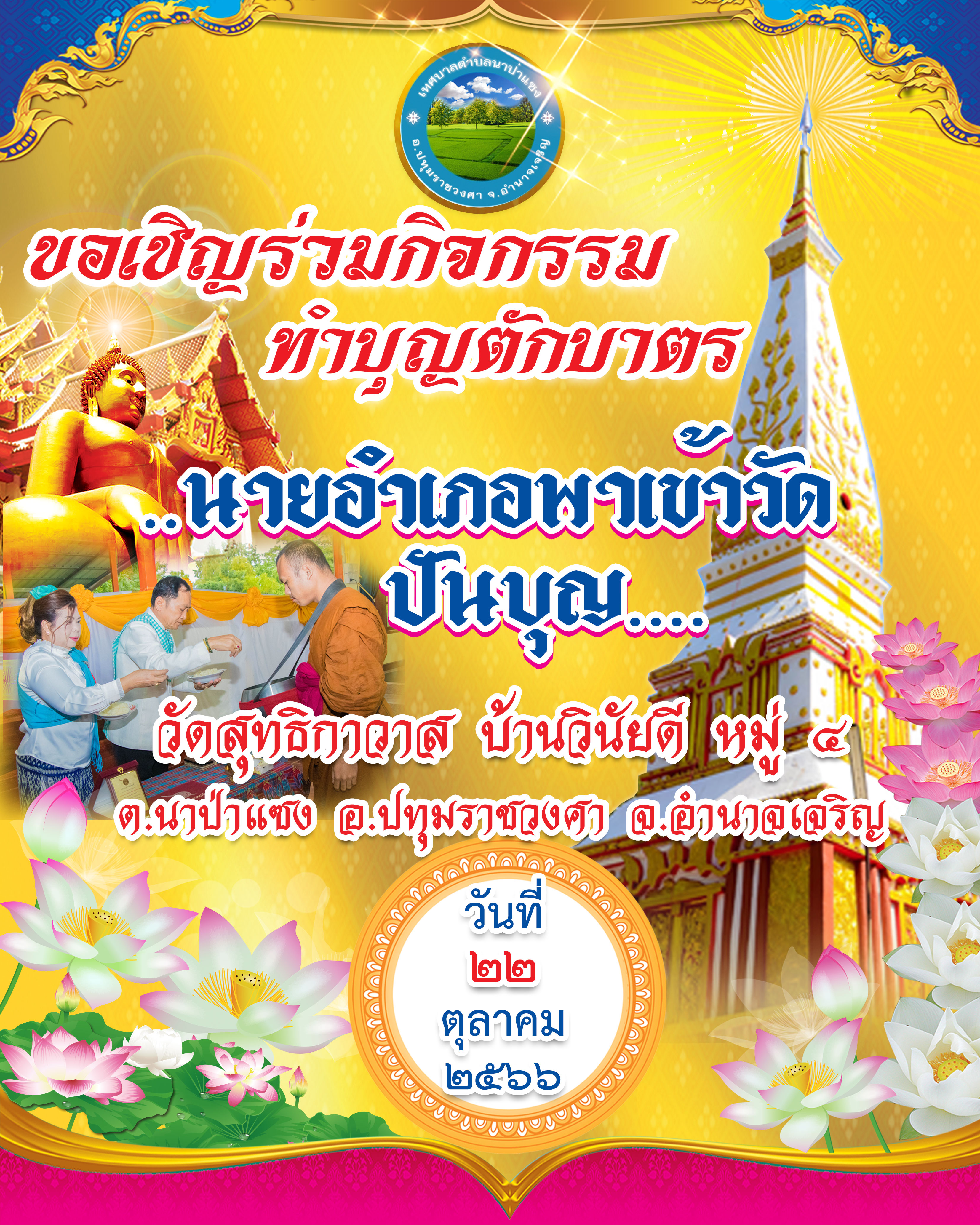 รายละเอียด : ขอเชิญร่วมกิจกรรม ทำบุญตักบาตร "นายอำเภอพาเข้าวัด ปันบุญ " ถวายภัตตาหารเช้า แด่ พระภิกษุสงฆ์ พร้อมทั้งได้มอบข้าวของก้นบาตรให้กลุ่มเปราะบางโดยมี นายนิกร ทองจิตร นายอำเภอปทุมราชวงศา เป็นประธานในพิธี ในวันอาทิตย์ ที่ 22 ตุลาคม 2566 ตั้งแต่เวลา 06.30 น. เป็นต้นไป ณ วัดสุทธิกาวาส บ้านวินัยดี หมู่ 4 ตำบลนาป่าแซง อำเภอปทุมราชวงศา จังหวัดอำนาจเจริญ