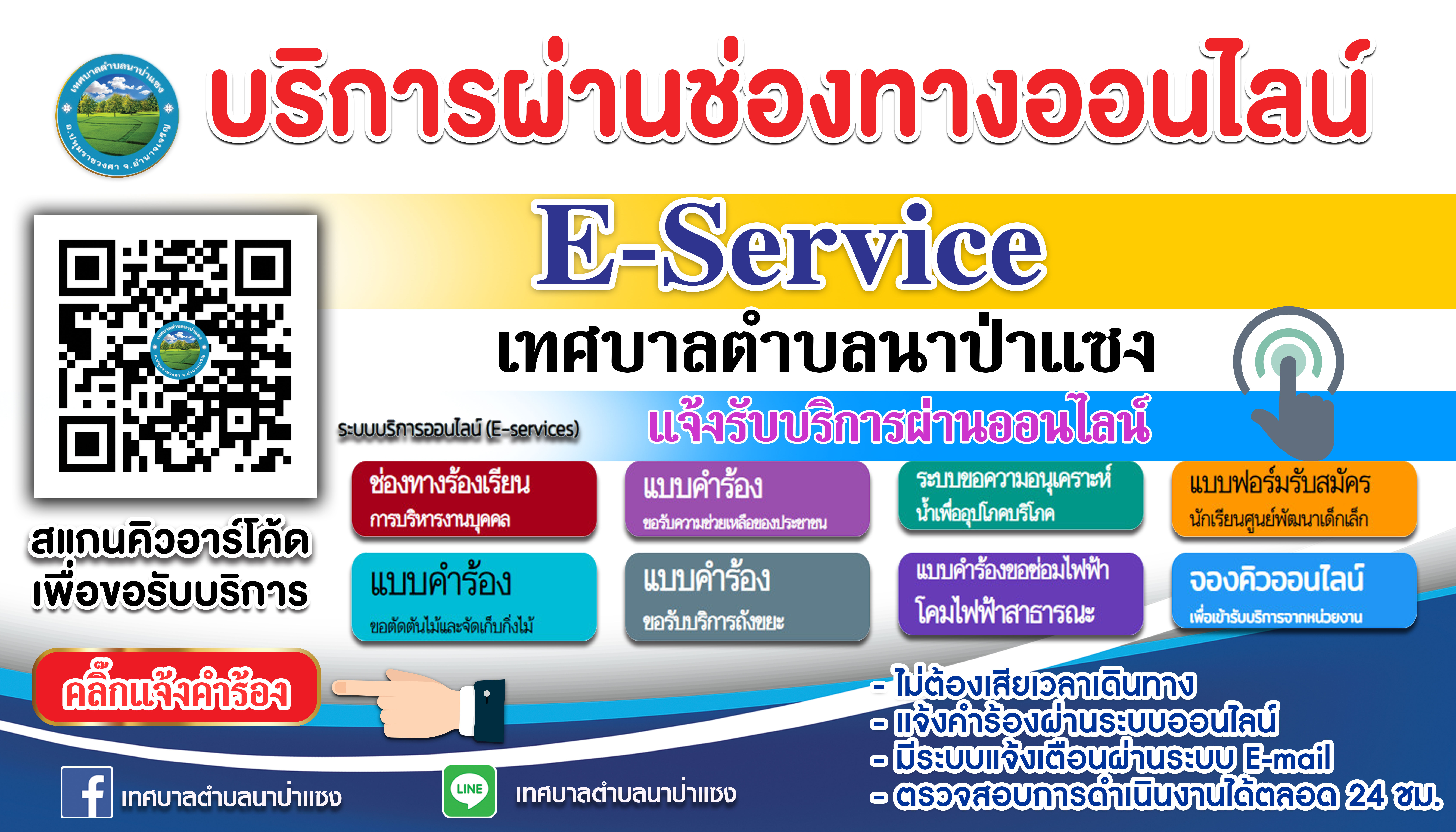 ด้วย เทศบาลตำบลนาป่าแซง ได้เปิดให้บริการ e-service แบบลงทะเบียนขอความช่วยเหลือของประชาชน ผ่านระบบออนไลน์ เพื่อความสะดวก รวดเร็ว โดย พี่น้องประชาชนสามารถเข้าไปลงทะเบียน ขอความช่วยเหลือ ในด้านต่างๆได้ โดยกรอกรายละเอียดตามแบบฟอร์มที่ต้องการให้ช่วยเหลือ และแนบไฟล์เอกสาร ส่งตรงถึงหน่วยงาน เทศบาลตำบลนาป่าแซง โดย พี่น้องประชาชน ไม่ต้องเสียเวลา เข้ามาติดต่อที่หน่วยงาน เพื่อลดระยะเวลาการเดินทาง