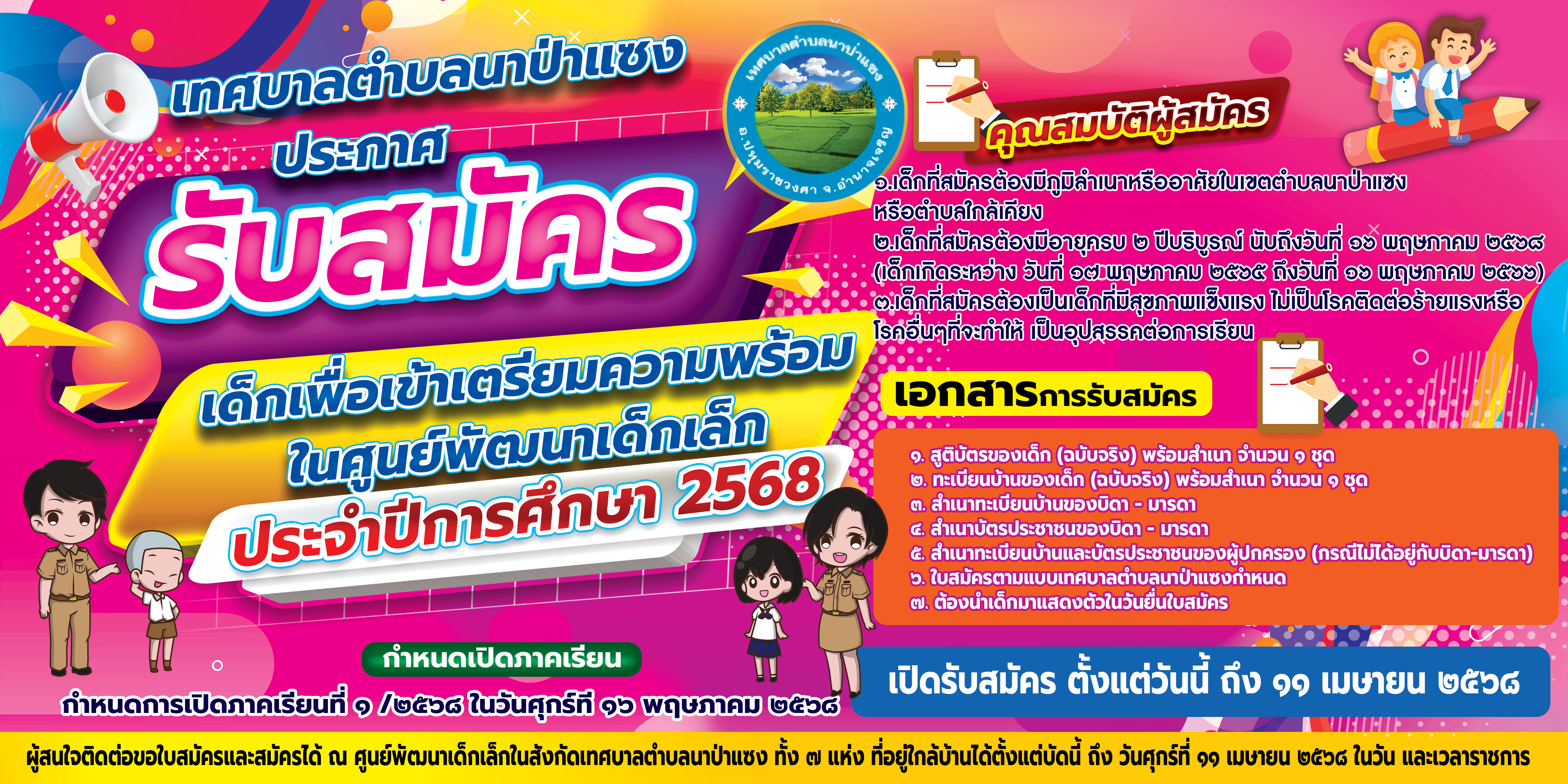 ประกาศเทศบาลตำบลนาป่าแซง เรื่อง รับสมัครเด็กเพี่อเข้าเตรียมความพร้อมในศูนย์พัฒนาเด็กเล็ก ประจำปีการศึกษา ๒๕๖๘