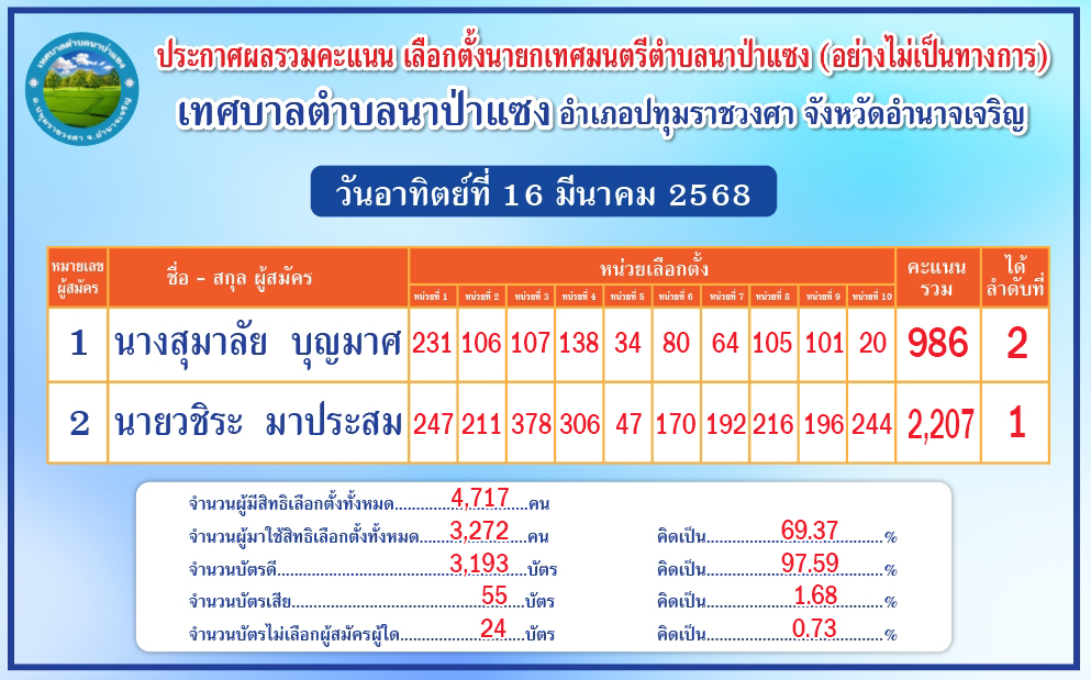 ชื่อเรื่อง : ประกาศผลคะแนนการเลือกตั้งนายกเทศมนตรีตำบลนาป่าแซง (อย่างไม่เป็นทางการ) วันที่ 16 มีนาคม 2568 ศูนย์ประสานงานการเลือกตั้งประจำเทศบาลตำบลนาป่าแซง อำเภอปทุมราชวงศา จังหวัดอำนาจเจริญ