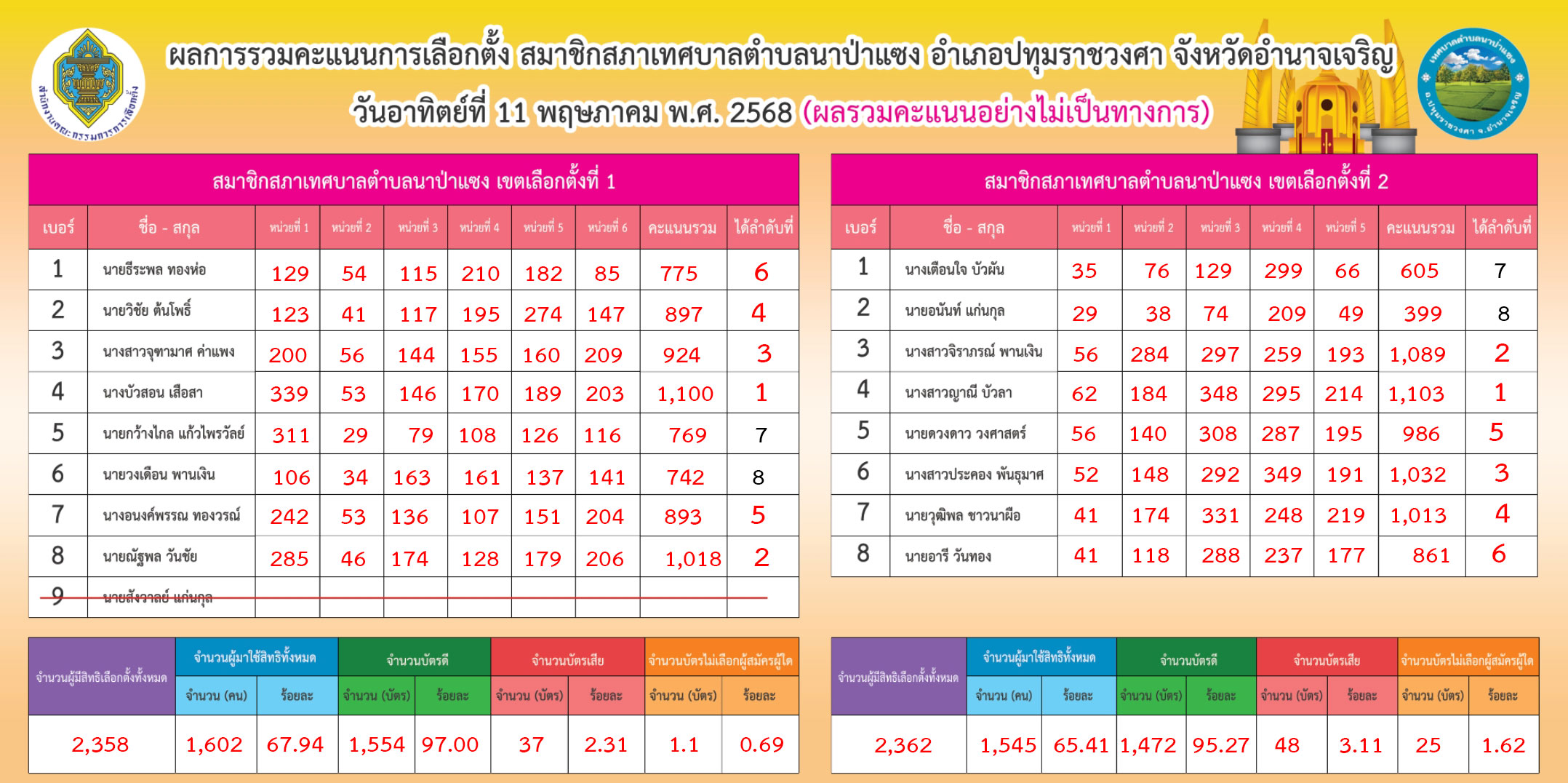 รายละเอียด : ประกาศผลคะแนนการเลือกตั้งสมาชิกสภาเทศบาลตำบลนาป่าแซง (อย่างไม่เป็นทางการ) วันที่ 11 พฤษภาคม 2568 ณ ศูนย์ประสานงานการเลือกตั้งประจำเทศบาลตำบลนาป่าแซง อำเภอปทุมราชวงศา จังหวัดอำนาจเจริญ