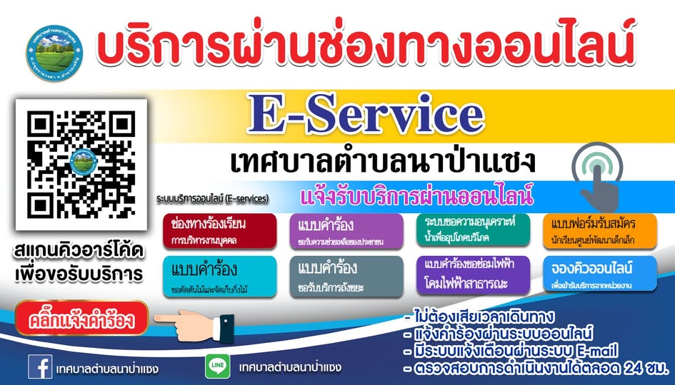ด้วย เทศบาลตำบลนาป่าแซง ได้เปิดให้บริการ e-service แบบลงทะเบียนขอความช่วยเหลือของประชาชน ผ่านระบบออนไลน์ เพื่อความสะดวก รวดเร็ว โดย พี่น้องประชาชนสามารถเข้าไปลงทะเบียน ขอความช่วยเหลือ ในด้านต่างๆได้ โดยกรอกรายละเอียดตามแบบฟอร์มที่ต้องการให้ช่วยเหลือ และแนบไฟล์เอกสาร ส่งตรงถึงหน่วยงาน เทศบาลตำบลนาป่าแซง โดย พี่น้องประชาชน ไม่ต้องเสียเวลา เข้ามาติดต่อที่หน่วยงาน เพื่อลดระยะเวลาการเดินทาง