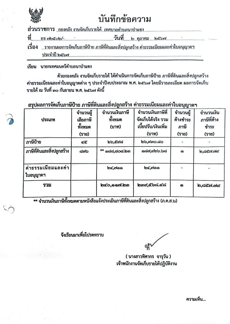 รายงานผลการจัดเก็บภาษีและค่าธรรมเนียม ประจำปีงบประมาณ 2567