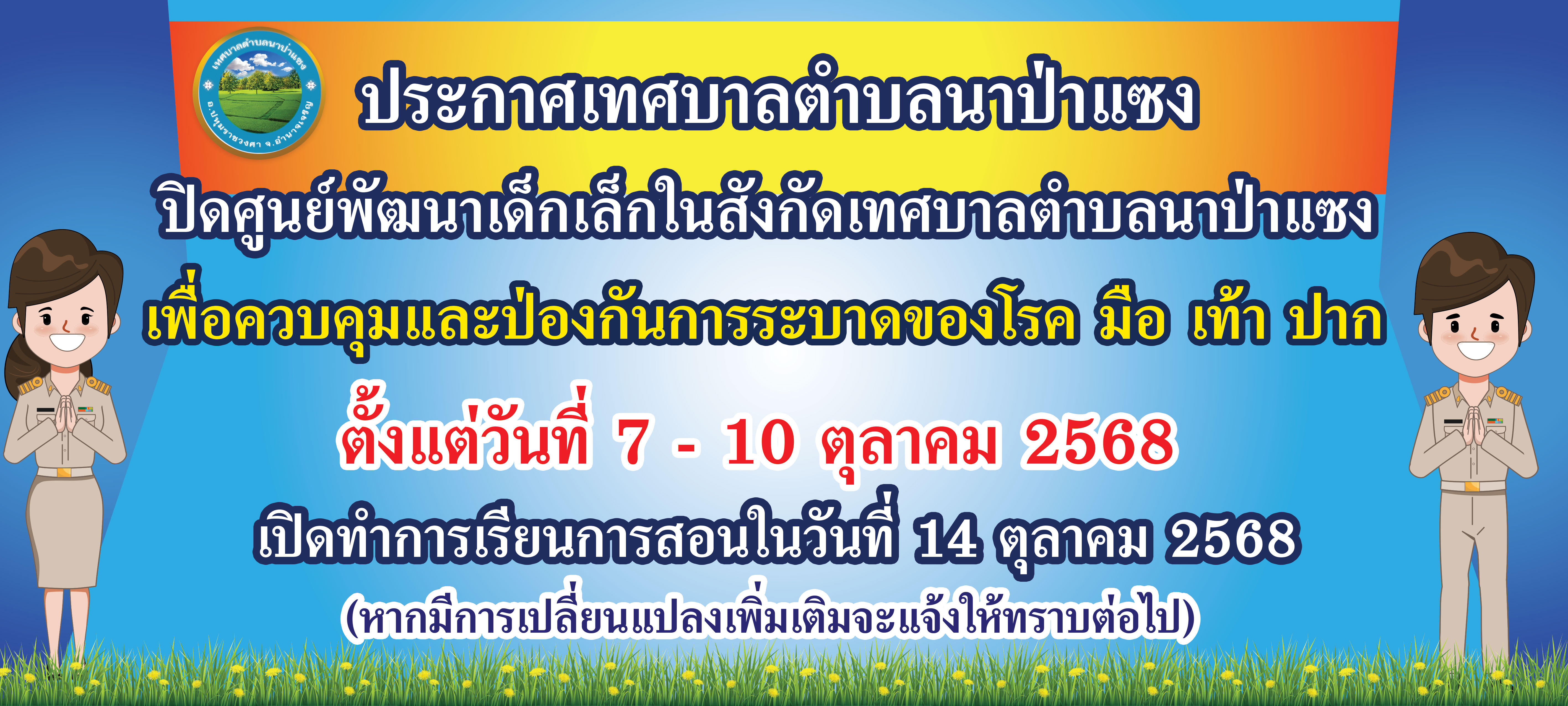 ชื่อเรื่อง : ประกาศเทศบาลตำบลนาป่าแซง เรื่อง ปิดศูนย์พัฒนาเด็กเล็กในสังกัดเทศบาลตำบลนาป่าแซง กรณีพิเศษ เพื่อควบคุมและป่องกัน การระบาดของโรค มือ เท้า ปาก