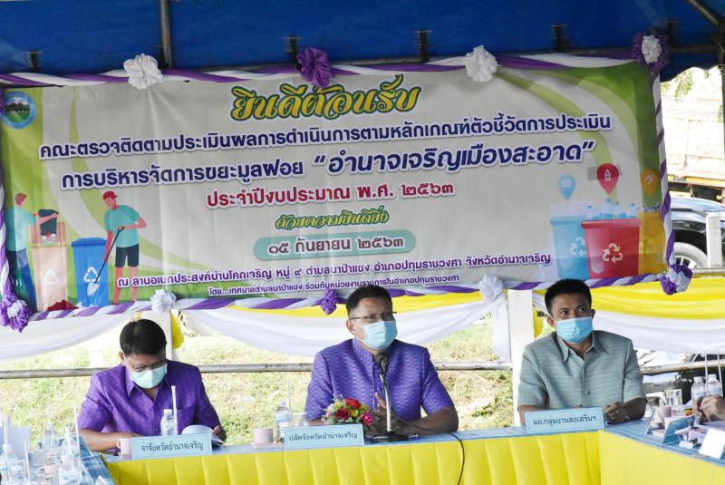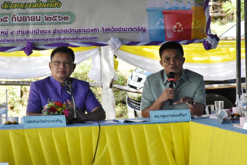 รายละเอียด : วันที่ ๑๕ กันยายน ๒๕๖๓ เวลา ๐๙.๐๐ น. เทศบาลตำบลนาป่าแซง ร่วมกับหน่วยงานราชการในอำเภอปทุมราชวงศา ได้ร่วมต้อนรับ นายศิริพันธ์ ขุ่มด้วง ปลัดจังหวัดอำนาจเจริญ พร้อมด้วยหัวหน้าส่วนราชการ คณะทำงาน จังหวัดอำนาจเจริญ ลงพื้นที่การตรวจติดตามประเมินผลการดำเนินการตามหลักเกณฑ์ตัวชี้วัดการประเมินการบริหารจัดการขยะมูลฝอย "อำนาจเจริญเมืองสะอาด" ประจำปีงบประมาณ พ.ศ. ๒๕๖๓ มีการตรวจคัดกรองเชื้อไวรัสโคโรนา ๒๐๑๙ ก่อนเข้าบริเวณงานจาก ทีม อสม. มีกิจกรรมฟ้อนรำต้อนรับจาก วิทยาลัยผู้สูงวัยไทนาป่าแซงบ่ถิ่มกัน นายปริโย โทบุตร ปลัดอำเภออาวุโส รักษาราชการนายอำเภอปทุมราชวงศา กล่าวต้อนรับ และรายงานฯ นายวชิระ มาประสม นายกเทศนนตรีตำบลนาป่าแซง กล่าวรายงานบริบทพื้นที่ตำบล นายชินวัตร จันทร์หอม กำนันตำบลนาป่าแซงกล่าวรายงานเพิ่มเติมเกี่ยวกับข้อมูลขยะในตำบล และ ผอ.กลุ่มงานส่งเสริมฯกล่าวบรรยาย นายศิริพันธ์ ขุ่มด้วง ปลัดจังหวัดอำนาจเจริญ บรรยายสรุปผลการดำเนินงานการบริหารจัดการขยะมูลฝอย "อำนาจเจริญเมืองสะอาด" ประจำปีงบประมาณ พ.ศ. ๒๕๖๓ และกล่าวให้กำลังใจในการทำงานทุกหน่วยงาน ทุกภาคส่วน มีหัวหน้าส่วนราชการ ท้องถิ่นอำเภอ สาธารณสุขอำเภอ นายกท้องถิ่นทุกแห่ง ข้าราชการ พนักงาน ลูกจ้าง ทต.นาป่าแซง ครูผู้ดูแลเด็ก อปพร. กลุ่มคัดแยกขยะที่ต้นทาง ม.๙ ท้องที่ ผู้นำชุมชน และมีการจัดบู๊ตร่วมจาก เครือข่าย พชอ.ปทุมราชวงศา ทต.ห้วย อบต.ลือ ทต.หนองข่า กลุ่มปลูกผักปลอดสาร กลุ่มทอผ้า ม.๔ และประชาชนในพื้นที่ร่วมกิจกรรมในครั้งนี้